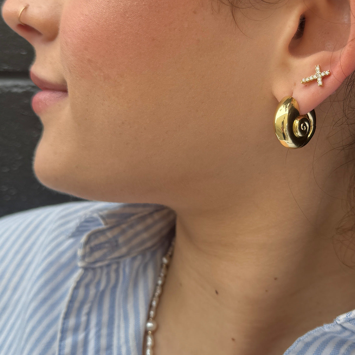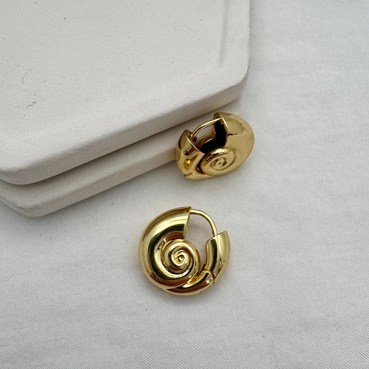 A golden nod to the sea. These sculptural spiral hoops are inspired by seashells and shoreline treasures—bold, beautiful, and effortlessly beachy. Like sunlight dancing on the tide, they bring a touch of coastal magic to your everyday look.