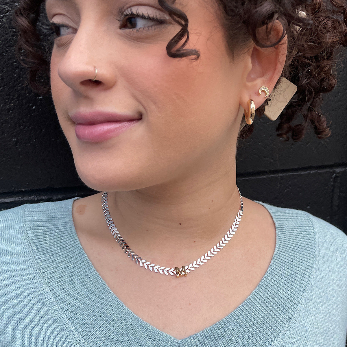 Take our gorgeous chevron link chain and add a sleek block initial and what do you get?  A chic and modern mixed metal look that will wow.  Whether you're wearing it alone or added to a stack this piece is a statement maker.