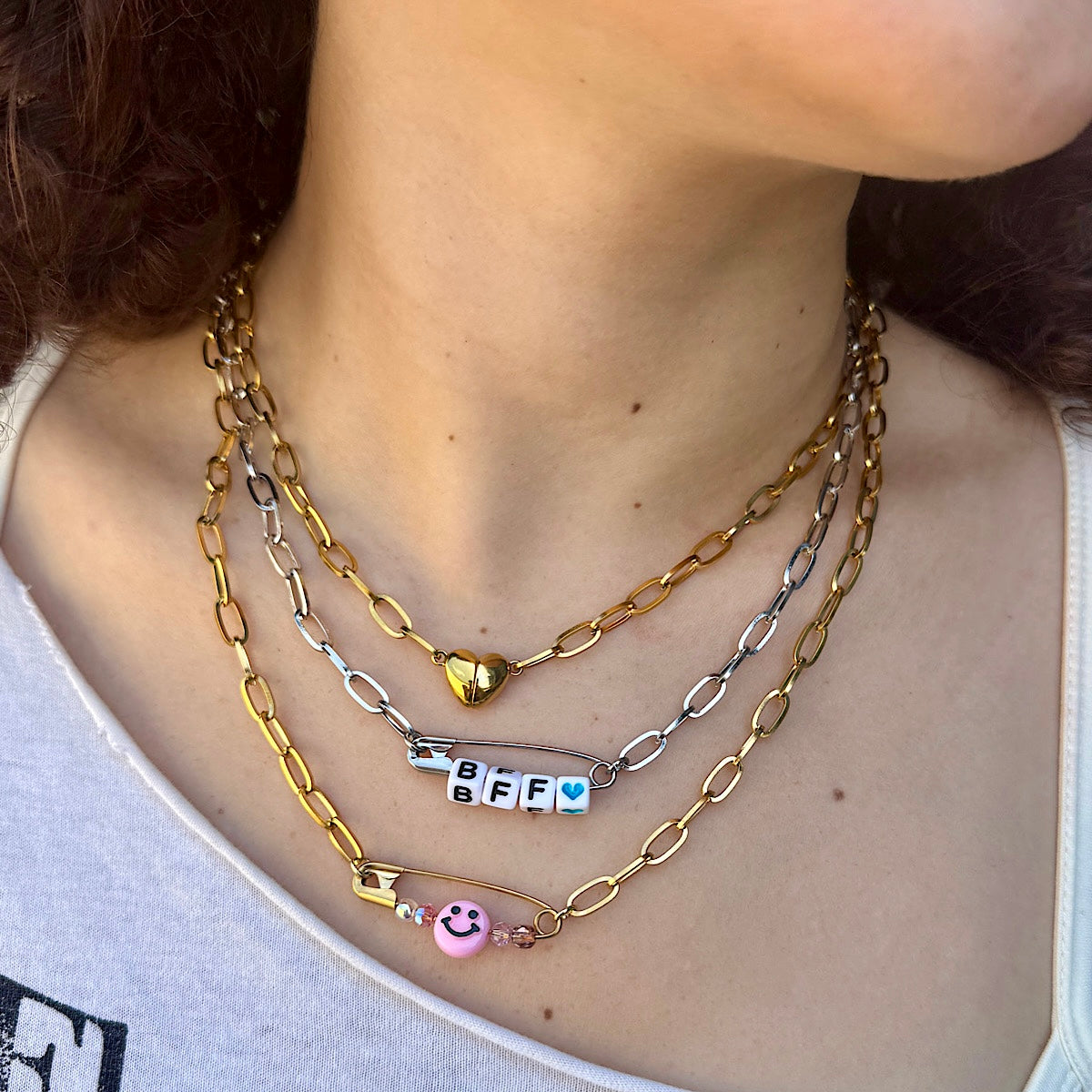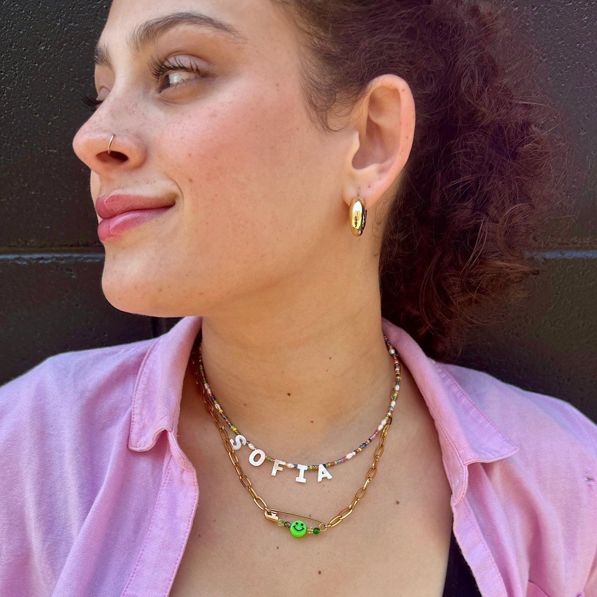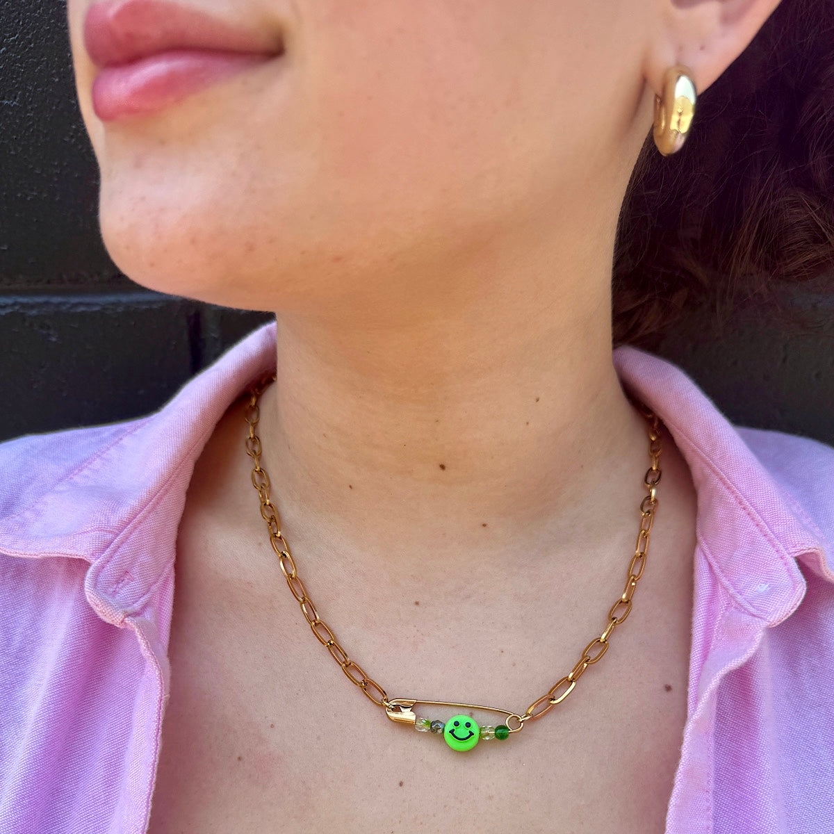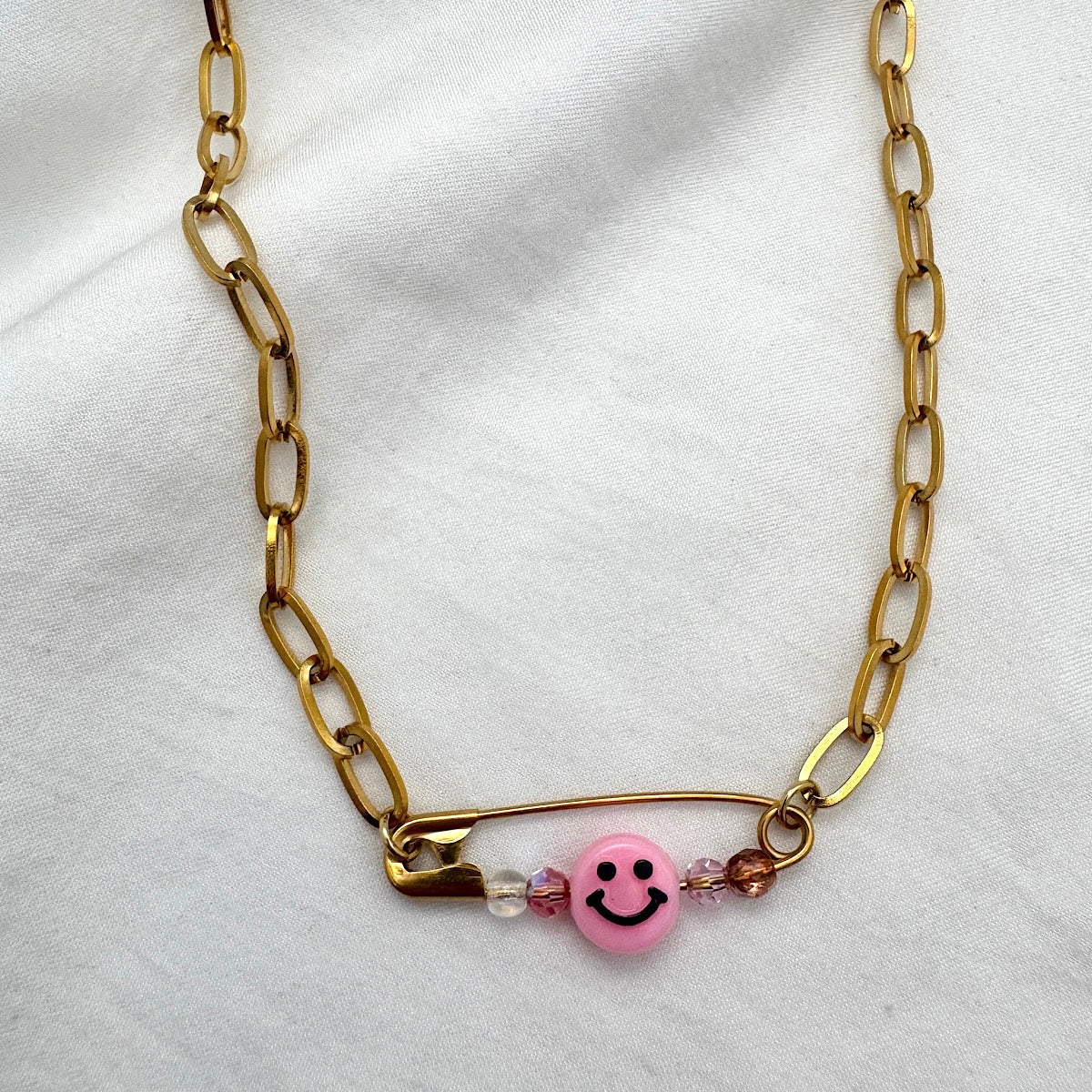 This isn’t the smiley face necklace from your childhood—it’s the elevated version with a bold streak. Featuring a safety pin charm and iconic smiley face, this necklace brings back that carefree, DIY spirit with a grown-up glow-up.