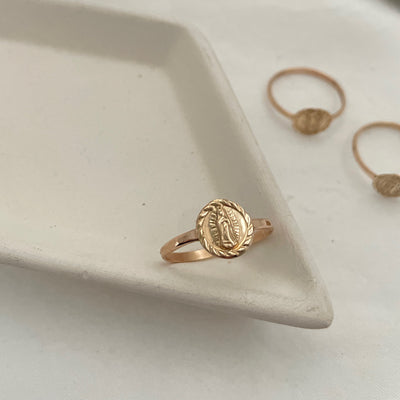 The Tiniest Miraculous Medal Ring features an abstract Virgin Mary small medallion measuring 8mm.